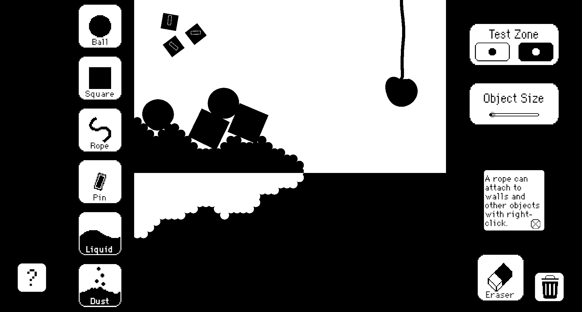 A small sandbox with progression. Experiment and play with the objects at your disposal to unlock new ones. If it gets tricky, use the hints to discover how to obtain them.